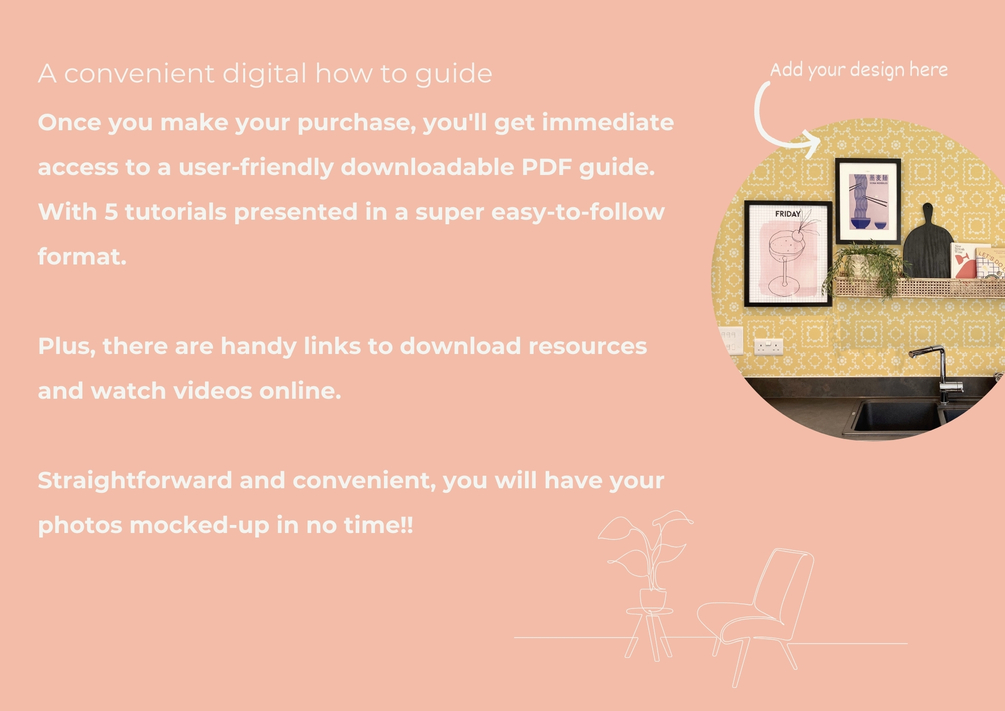• X1 A4 sized PDF Guide to creating photo mockups, that includes links to the video tutorials and downloadable filesX1 downloadable Kitchen scene photo. File format 300dpi .jpg (Pixel size W2712 X H2480)X1 downloadable Kitchen Scene with layers ready mocked up to add your pattern. File format 300dpi .procreate (Pixel size W2712 X H2480)Video 1 A brief guide to stock photo licensing (not legal advice)Video 2 Using stock photos hints and tipsVideo 3 Taking your Own PhotosVideo 4 Procreate pattern tile resizeVideo 5 Create mock-up photos in Procreate