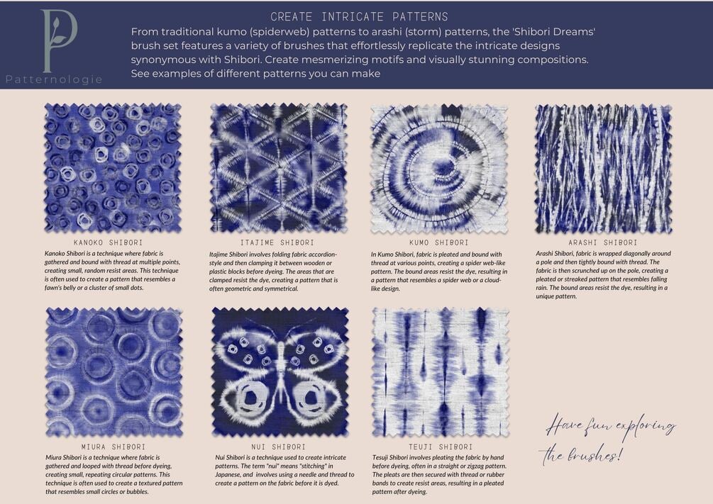 Developed using real printed textures, the brushes enable the mark-making qualities of this remarkable textiles technique. Now, you can confidently create shibori styled motifs for your own designs, effortlessly capturing the essence of Shibori.